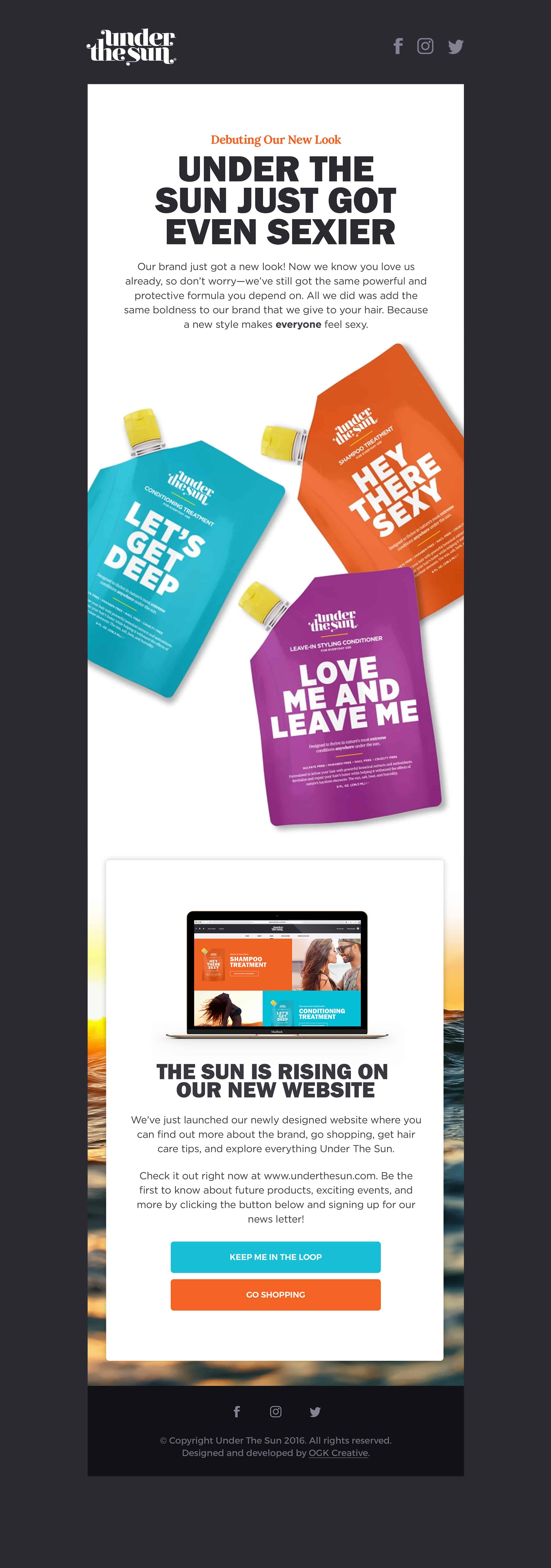 Our goal for Under The Sun’s digital marketing campaign was to grow a following of loyal brand lovers. We scheduled social media posts on Facebook, Instagram, and Twitter playing to each platform’s strengths while tying them all together with cohesive messaging that reflects the brand in its entirety.